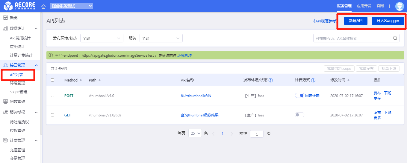 1)环境注册——创建服务环境。完成API类型信息提交后,系统默认进入到API管理-环境管理配置页