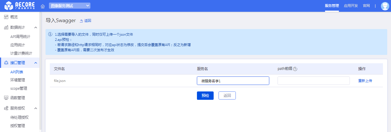 批量导入swagger,选择文件,请填写对应的服务名称(尤其是在多微服务的情况下),以便于后期根据服务名称筛选API。