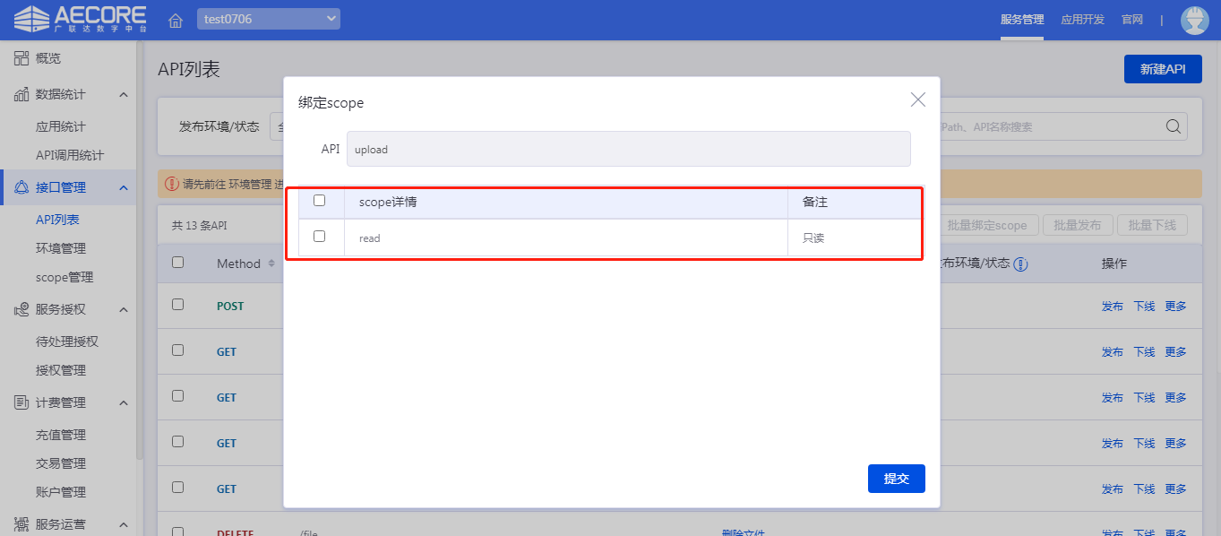 将API于scope关系绑定,可针对单个接口逐一绑定scope,也可以多选接口批量绑定