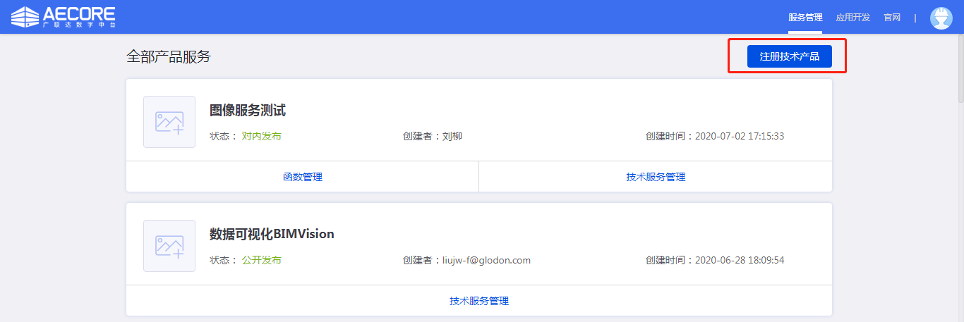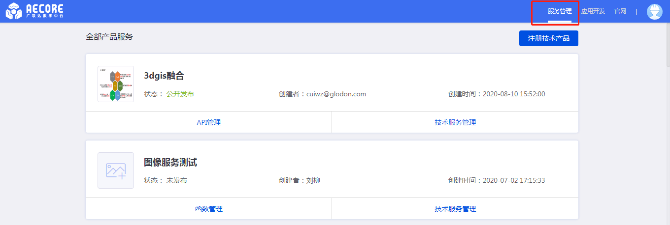 服务注册步骤完成后,等待AECORE管理员在后台审核并发布服务。服务发布后即会出现在ISV控制台,所有的开发者可以通过AECORE调用该服务。