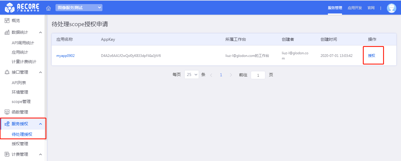 3-2)进入服务工作台,选择服务授权-待处理授权(以图像服务测试为例)