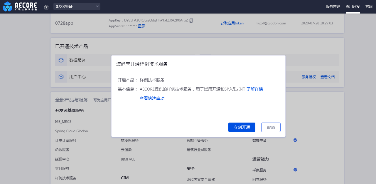 应用创建成功后,即进入应用详情页,在应用详情页内选择该应用需要订阅的服务。选择我们刚发布的服务,立即开通。
