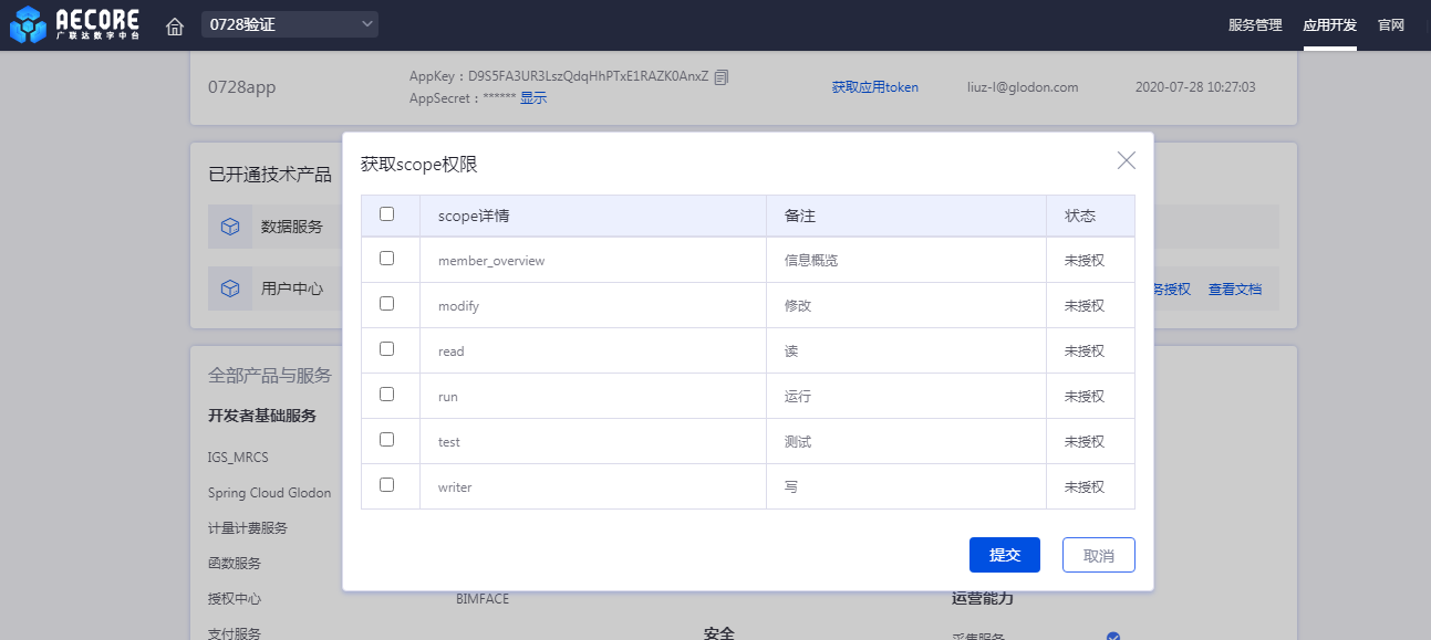 若服务设置了scope权限,那么开通服务时需要选择所需的服务权限,授权后调用才生效(scope授权在SP工作台-授权管理页面操作);