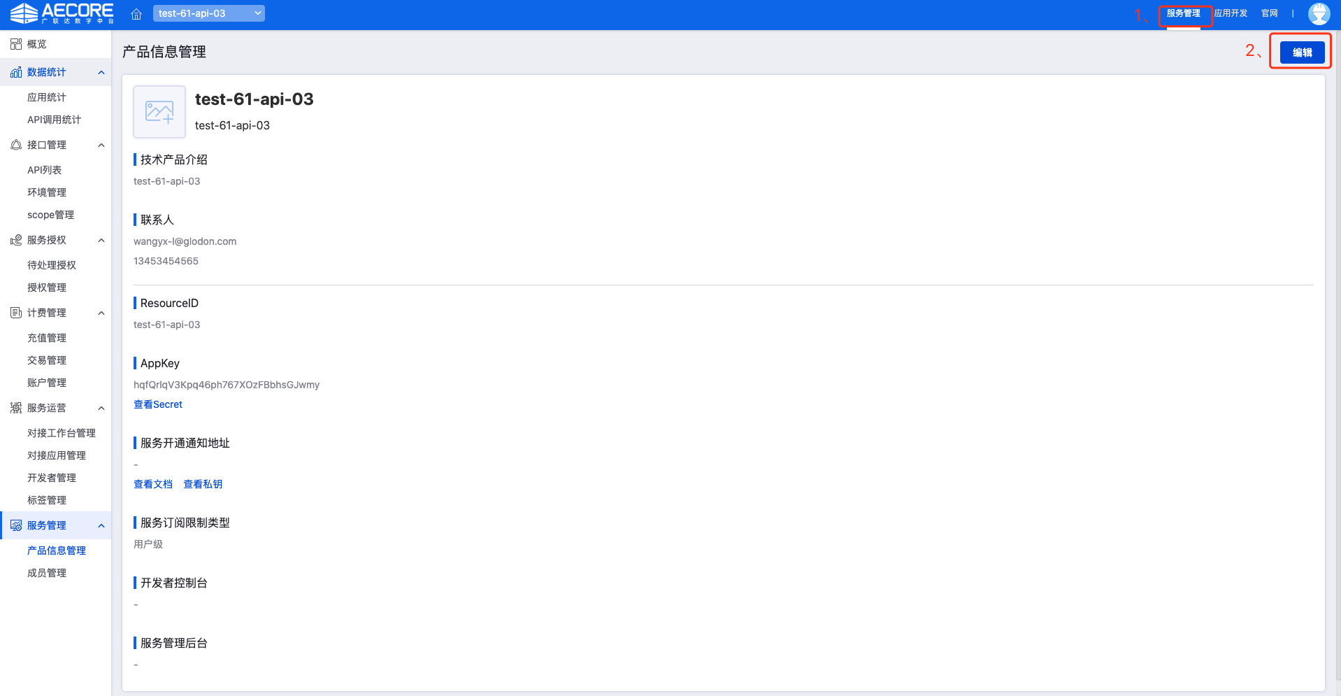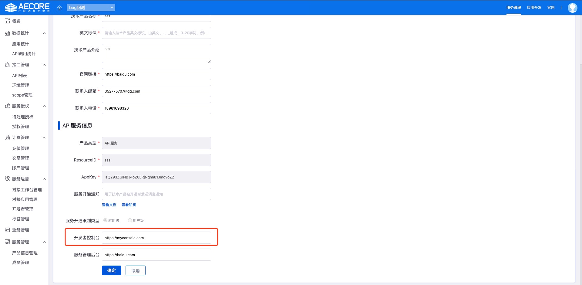 技术产品名称、英文标识(全局唯一,用于标识服务,请起有意义的名称)、技术产品简介、联系人邮箱与电话,选择服务类型(本节主要讲述API类型服务)