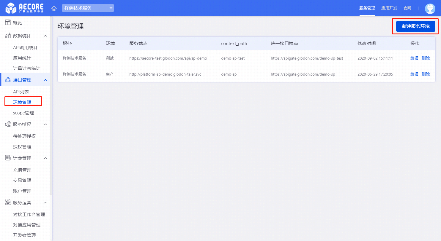 在SP控制台下的接口管理菜单中选择环境管理,点击新建服务环境;