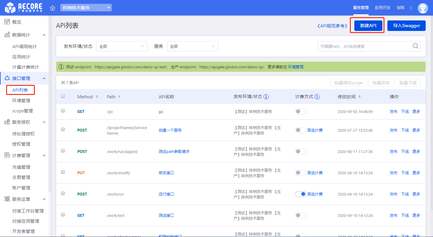 在SP控制台下的接口管理菜单中选择API列表,进行API的创建。这里提供两种创建API的方式供您选择,分别是创建单个API和通过swagger批量创建API。