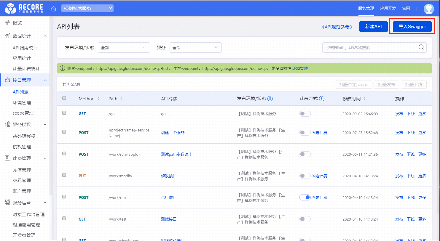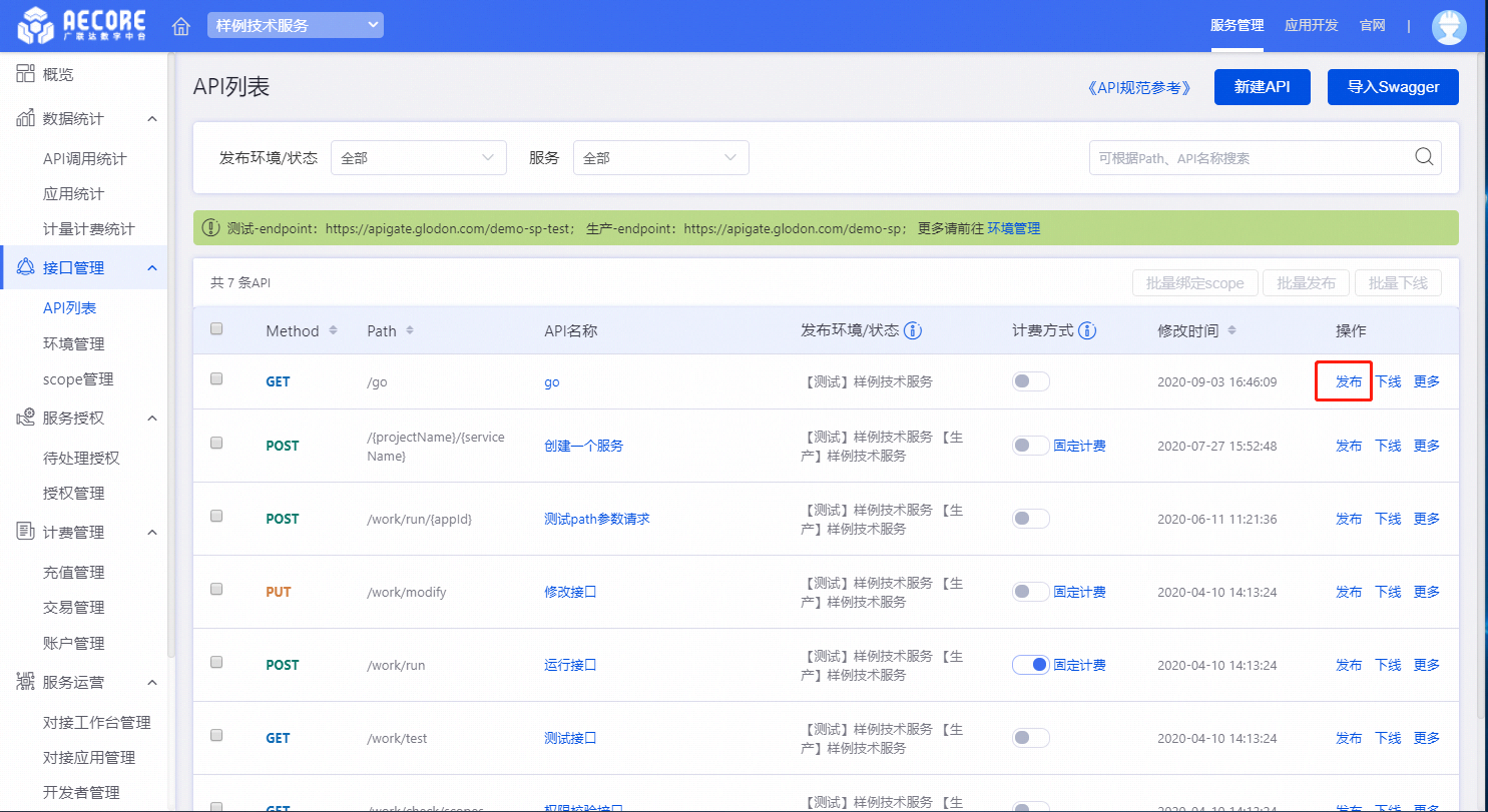 在API列表页面点击发布将对应API发布到指定的环境。