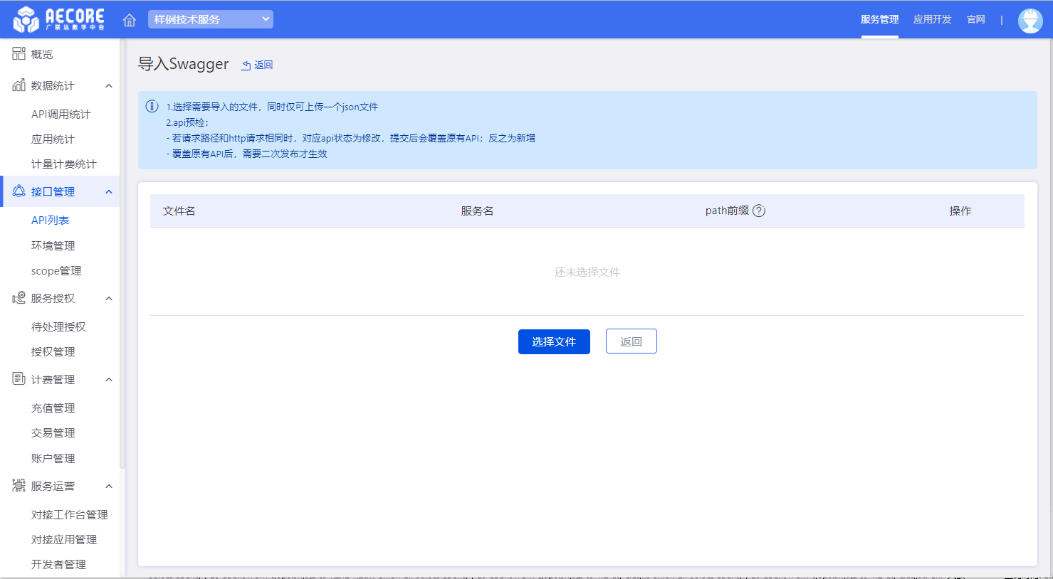 在API列表页面点击导入swagger,选择导入的文件,同时仅可上传一个json文件。