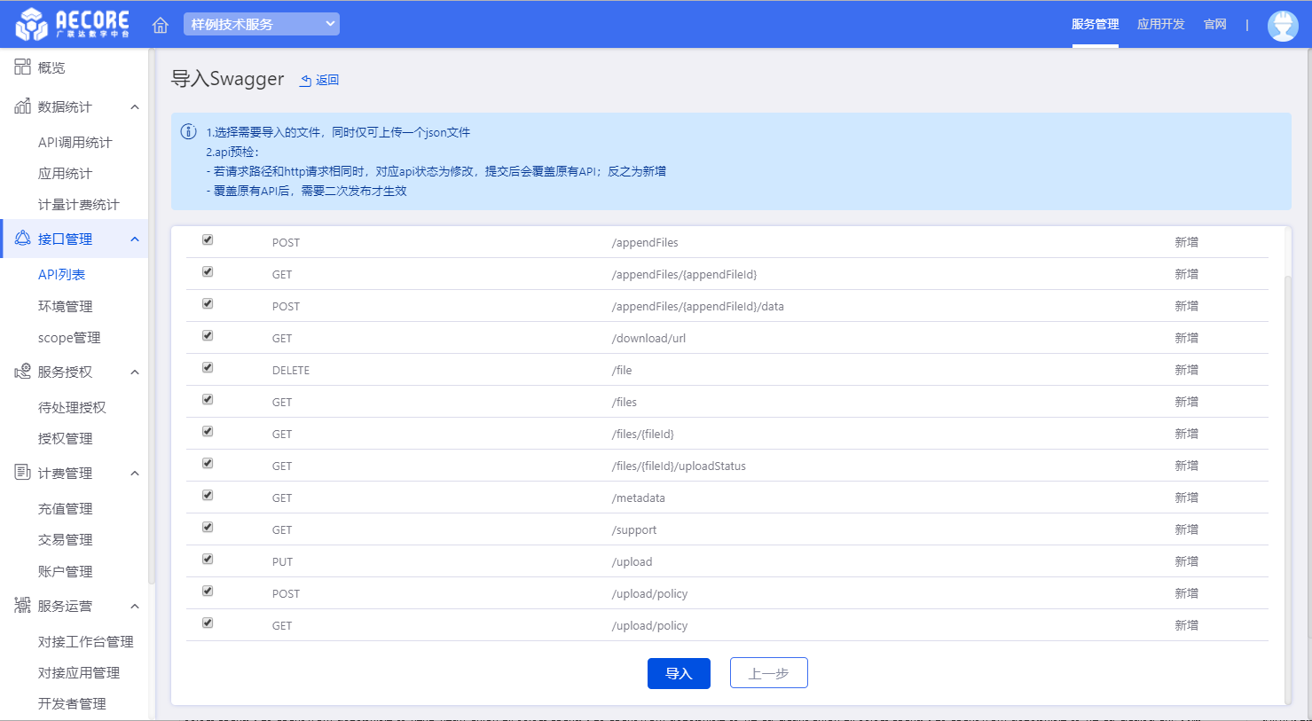 选择文件之后点击预检。若请求路径、方法和http请求相同时,对应api状态为修改,提交后会覆盖原有API;反之为新增。覆盖原有API后,需要二次发布才生效。