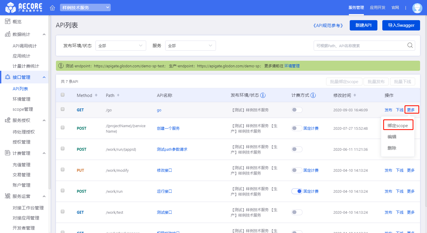 在API列表界面点击更多,选择绑定scope进行scope绑定。