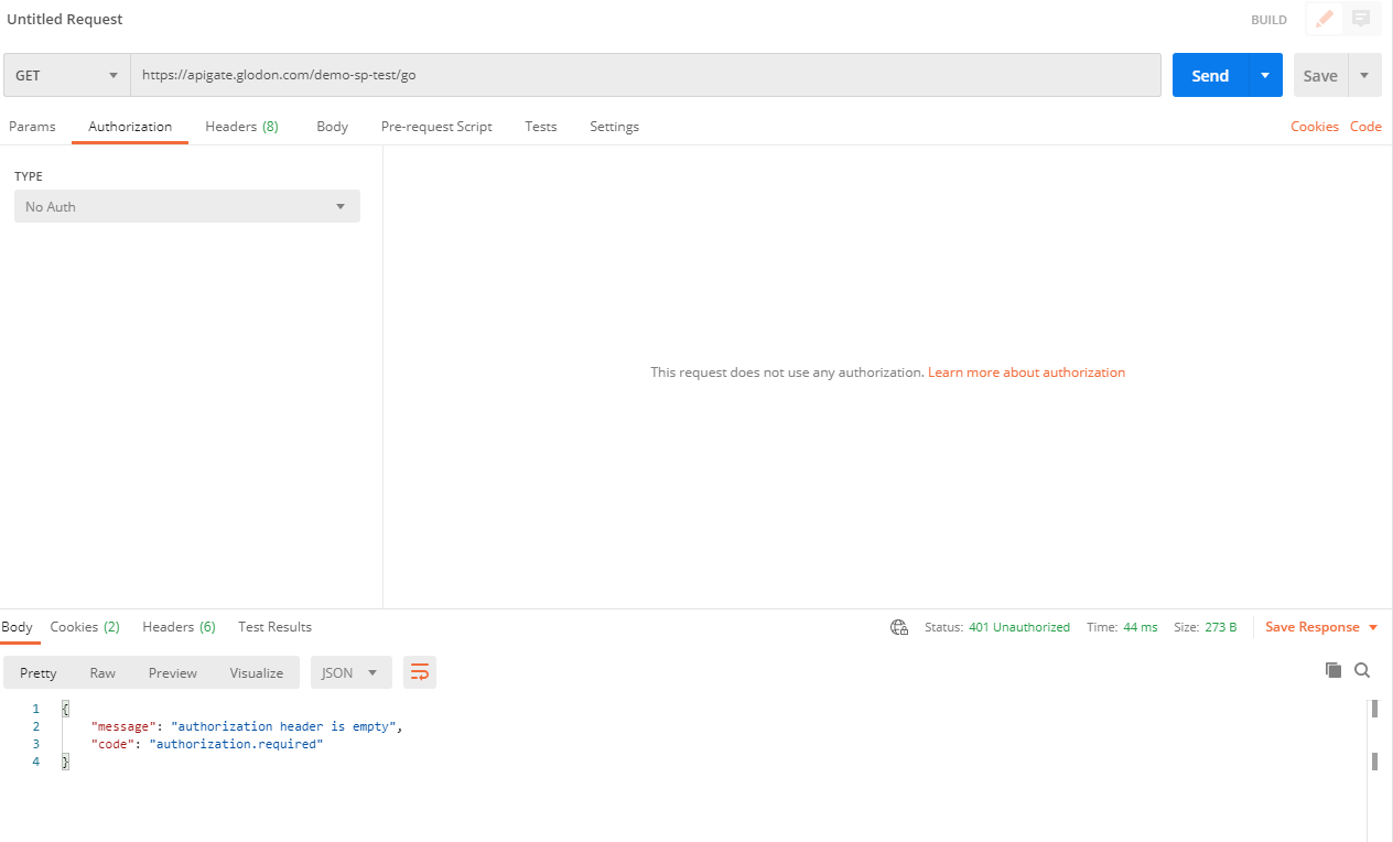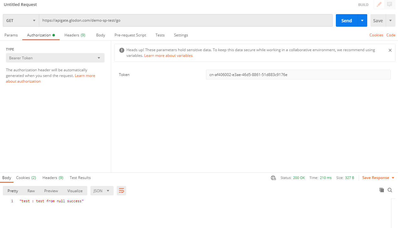 成功发布API之后,我们通过Postman调用/go接口进行测试。因为接口设置了OAUTH2认证,所以需要获取访问服务的token,可参照如下接口鉴权文档。调用结果如下图,可以看出不携带token时访问失败。