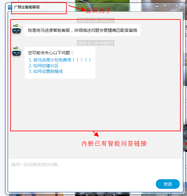 机器人嵌入到网页后的效果如下,机器人悬浮在网页的右下端,点击机器人即可开始问题的咨询。
