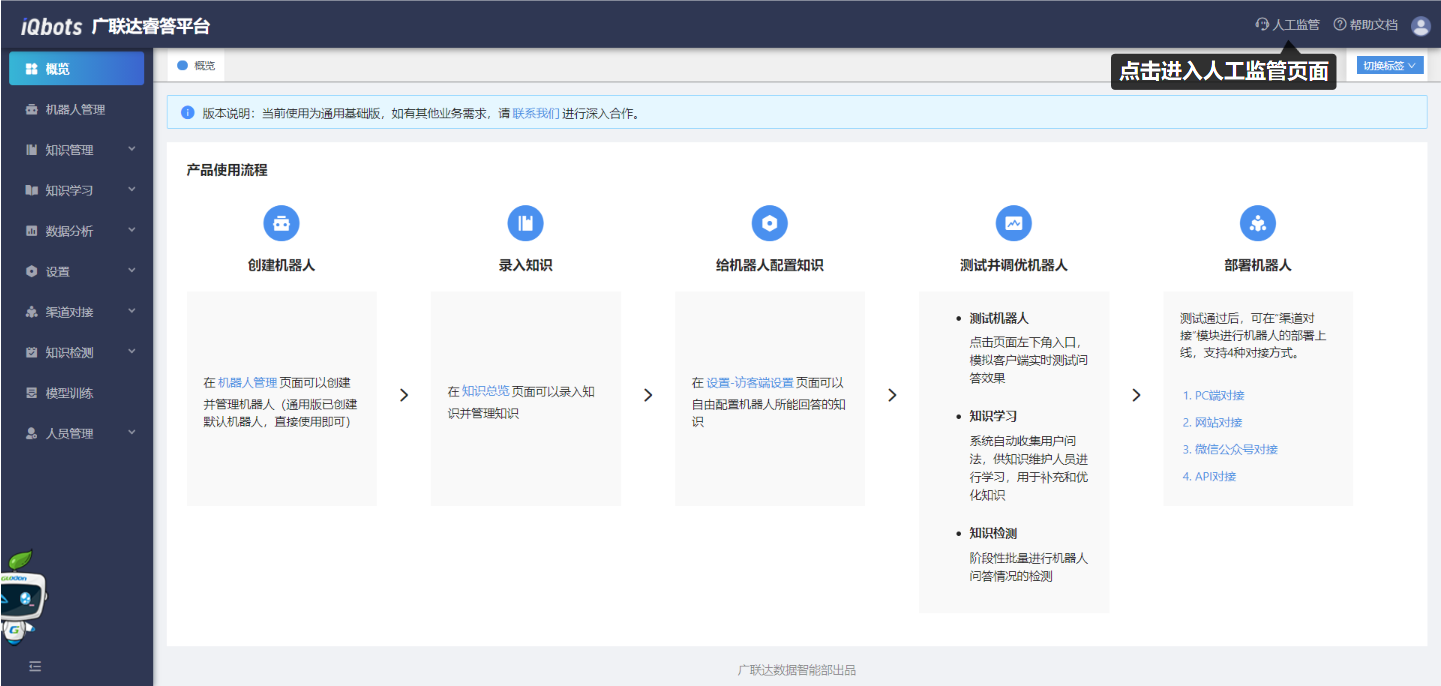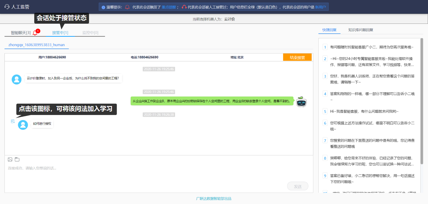 点击首页中右上角的“人工监管”图标,可以进入相应的人工监管服务页面。在人工监管页面中,可以选择需监控的机器人,并看到智能聊天的会话。在机器人回答效果不好时,主动接管会话进入人工服务后,可有效及时地解决用户问题,提升用户体验。