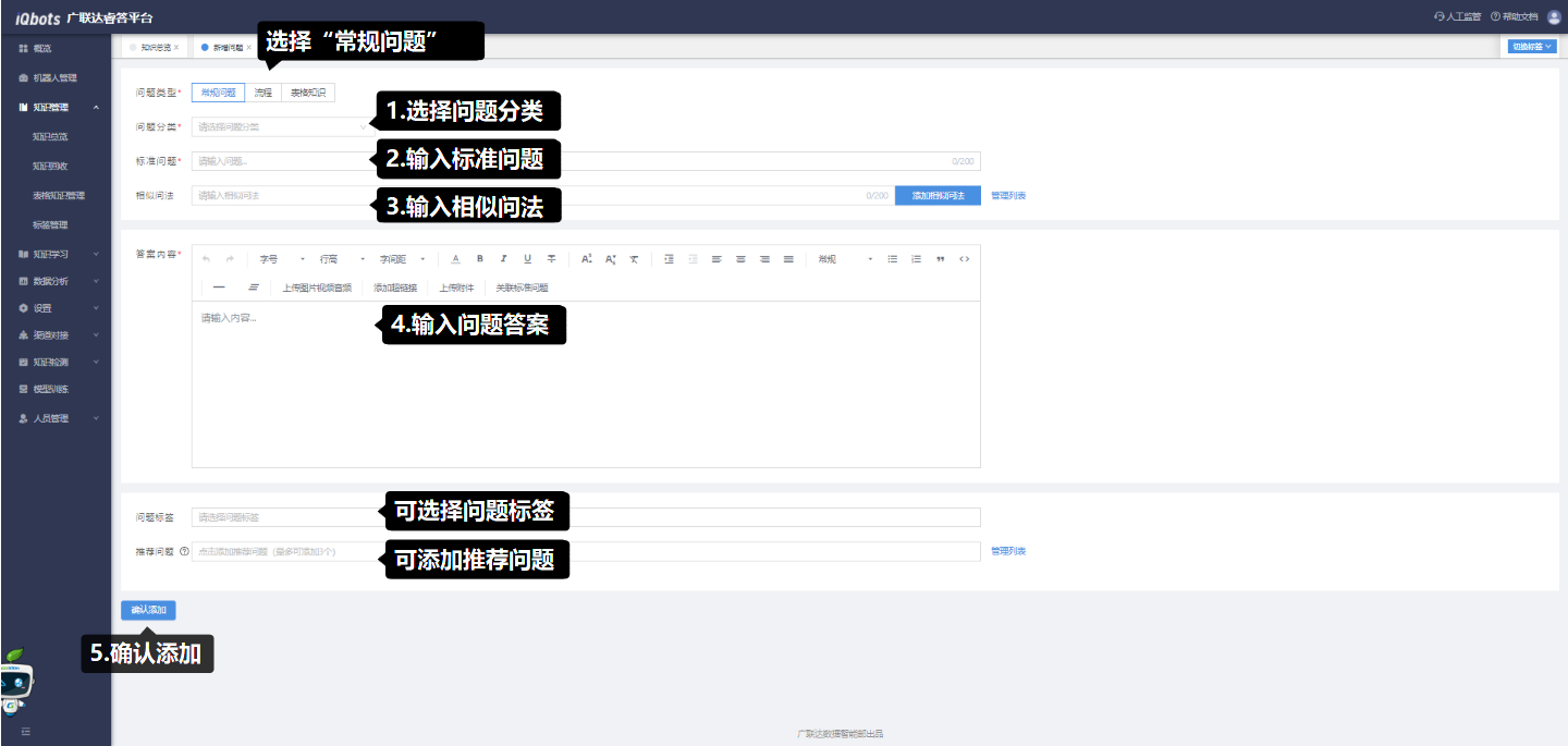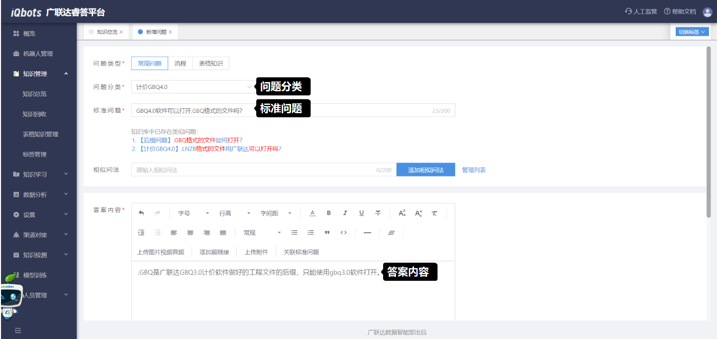 在知识总览页面,可以完成知识分类管理、问题的增删改查、问题的相似问法管理等。