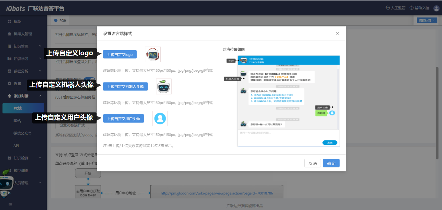 支持访客端样式设置,可上传自定义logo、自定义机器人头像、自定义用户头像;