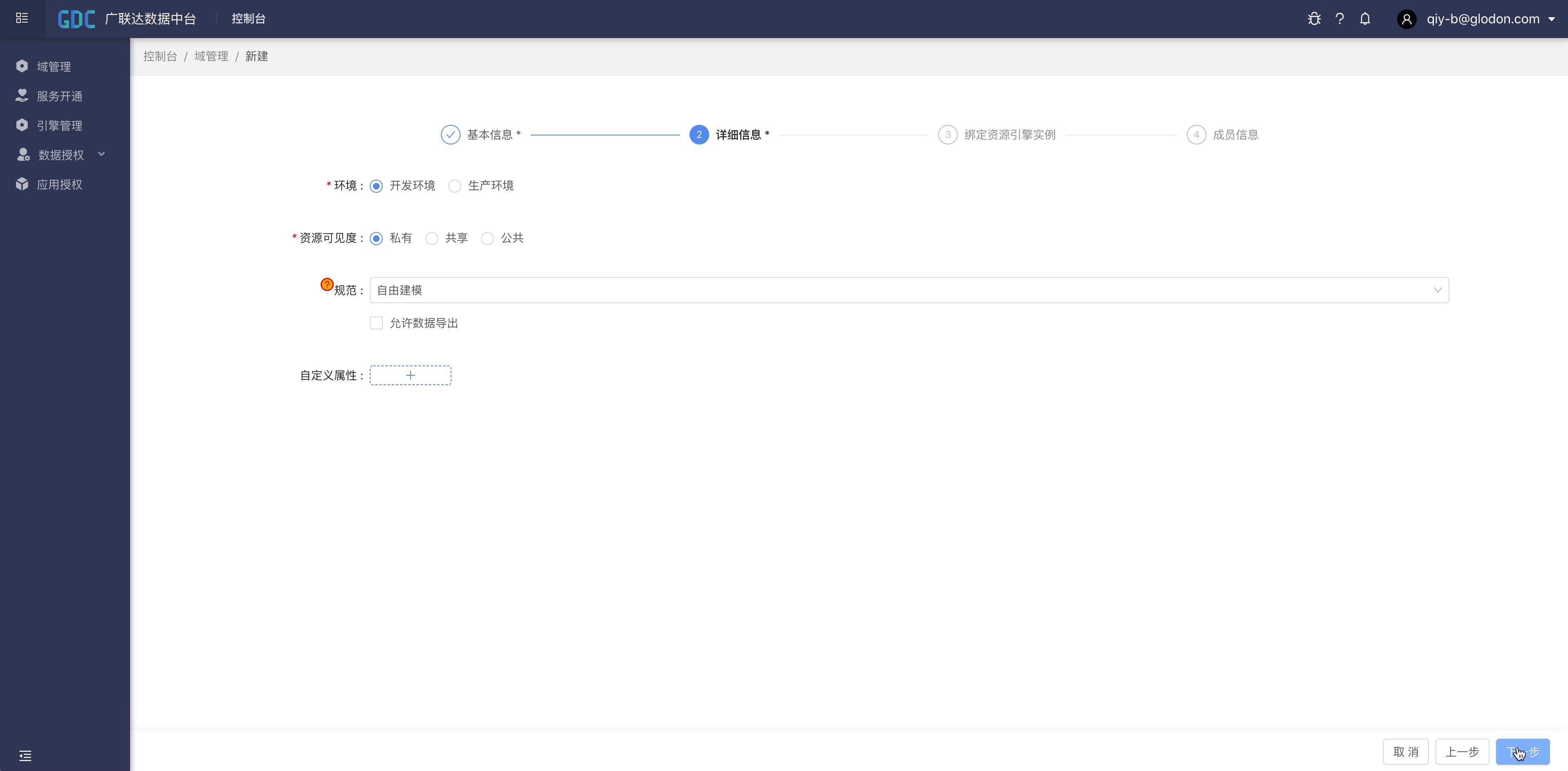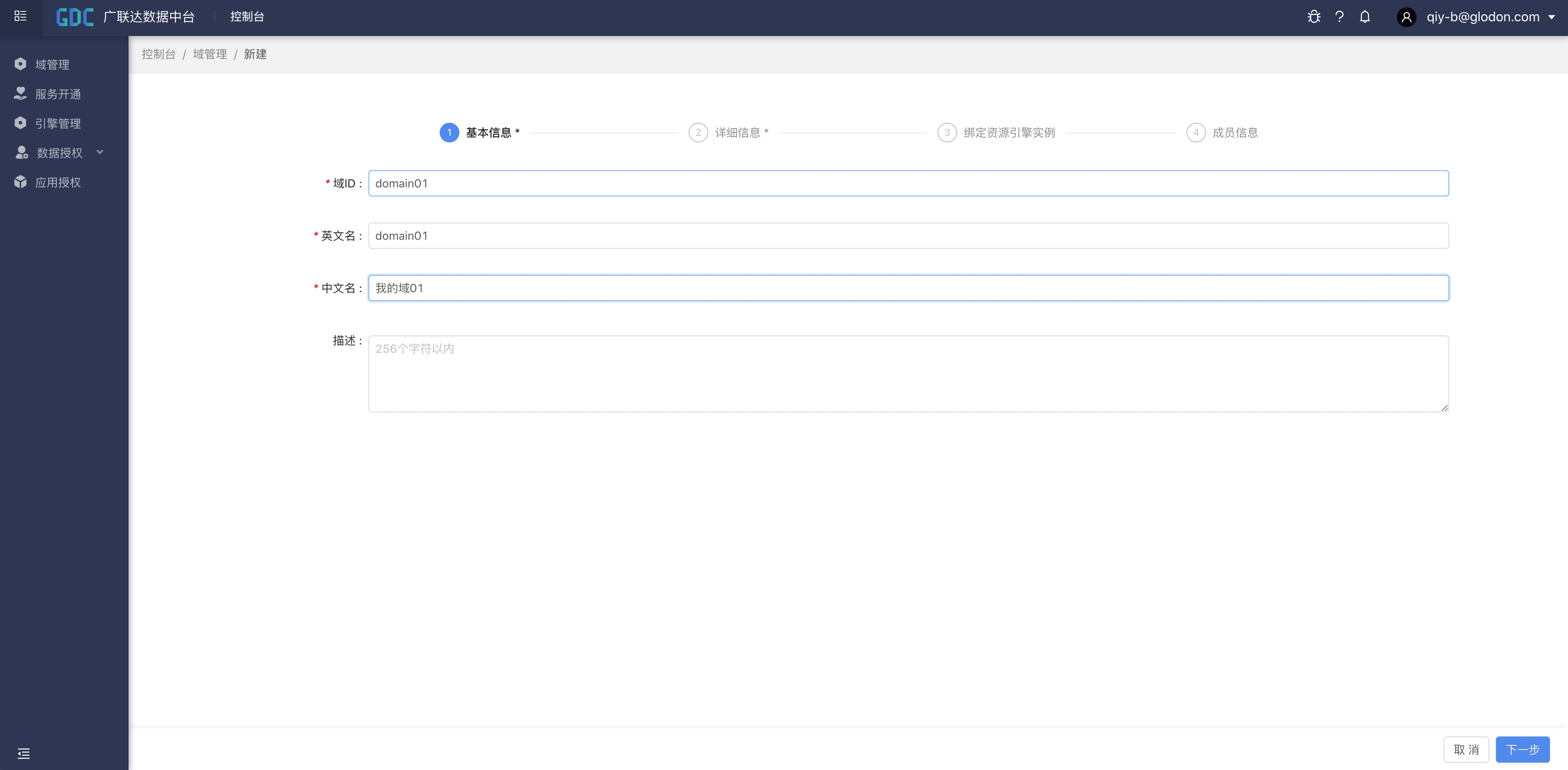 点击“创建域”按钮,输入域的编码、英文名、中文名、描述等信息,点击“下一步”