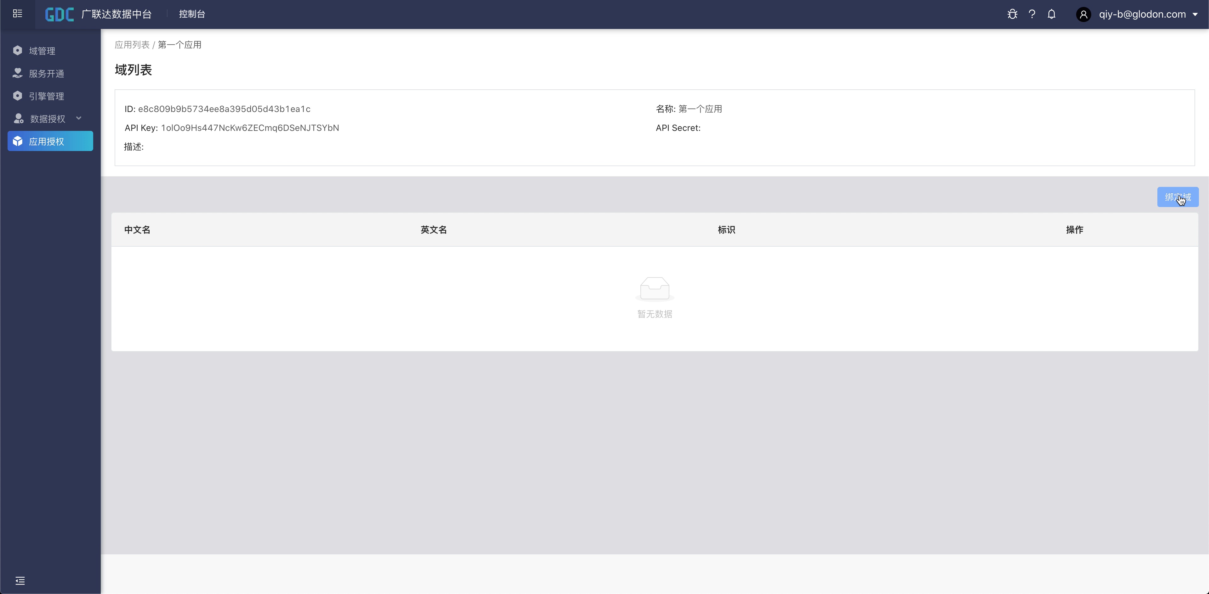 进入到应用详情后,点击“绑定域”,选择要访问的资源所在的域,在此我们选择前面创建好的“我的域01”,提交。