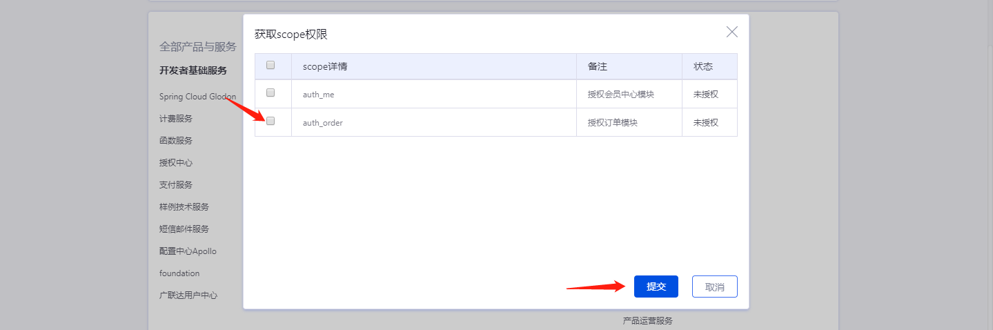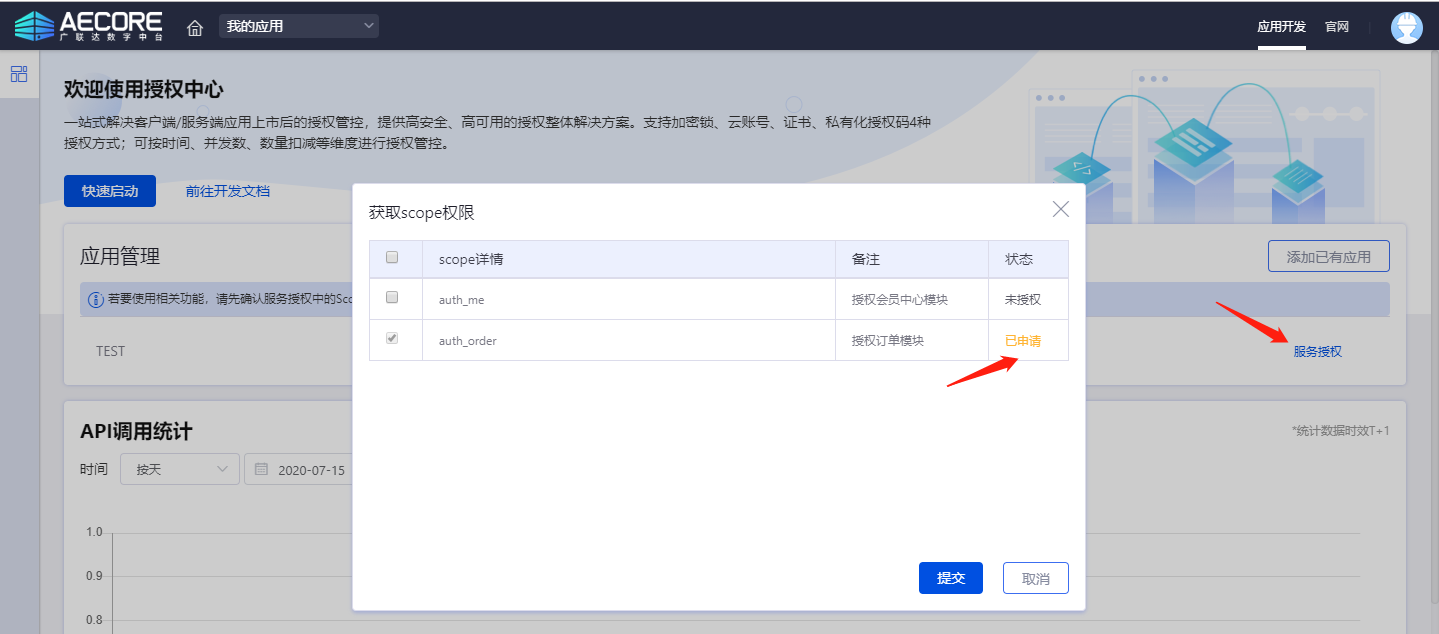 应用创建后选择并开通本服务,申请应用scope
