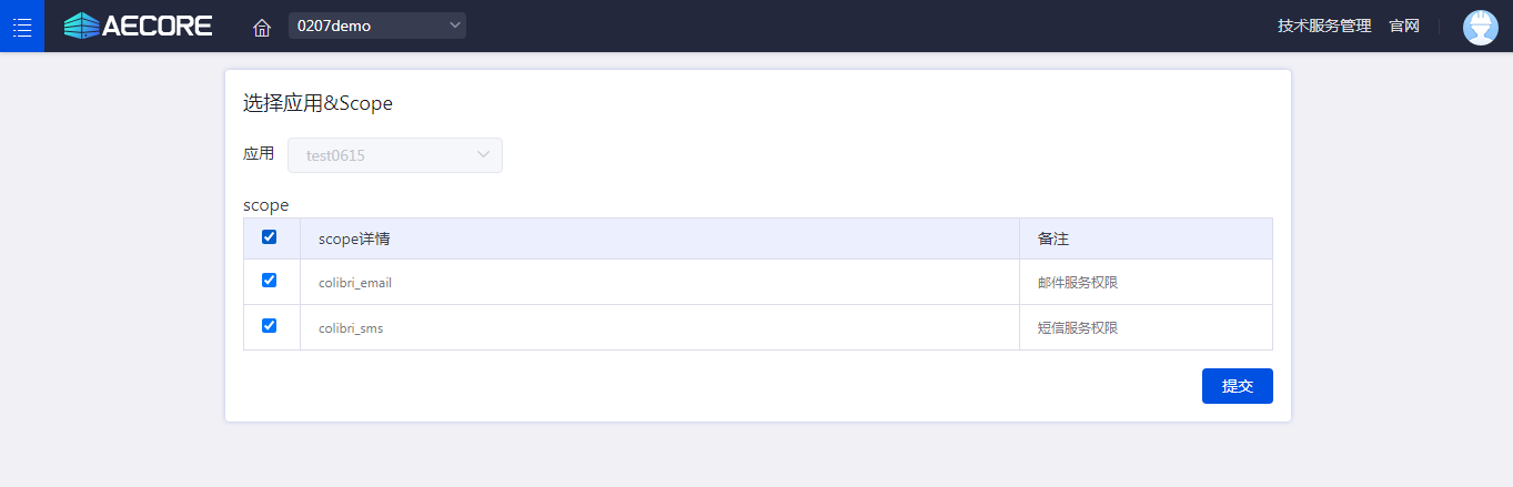应用创建后选择并开通本服务,申请应用scope