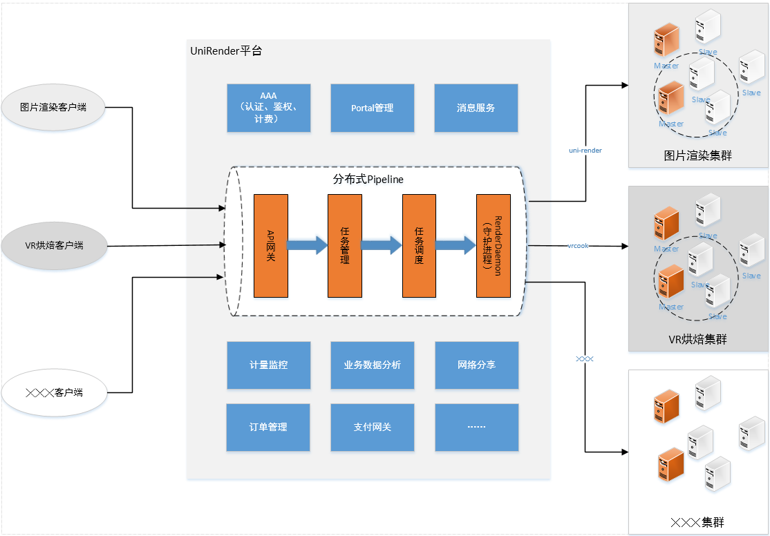 云渲染服务提供端到端的一站式完整解决方案,系统架构上将各种形态的渲染计算(如:图片渲染、模型烘焙、效果动画、全景图、光纹理烘焙等)与渲染业务上云过程管理进行解耦。其中,渲染计算服务需要根据具体需求进行一定程度的定制适配,渲染业务管理则完全通用,基本无任何额外定制工作。云渲染服务的系统架构如下图所示。