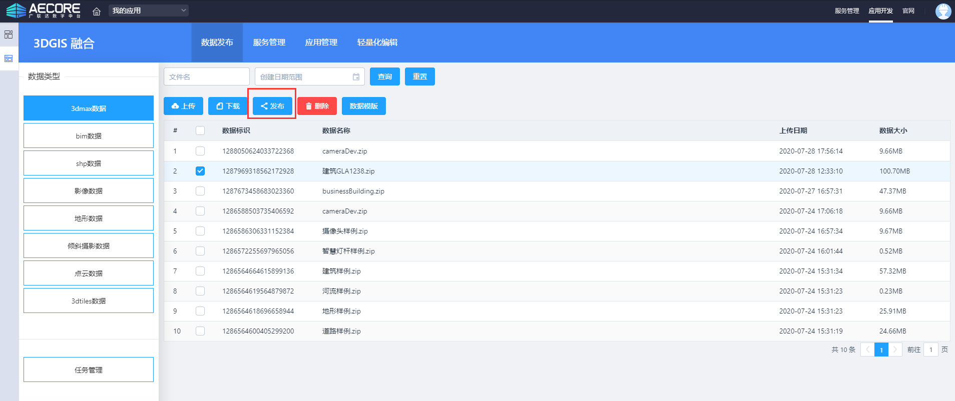 在数据列表中选择要进行发布的3dmax数据,此时,列表上方的操作【上传】、【下载】、【发布】、【删除】均可以进行操作,如下图: