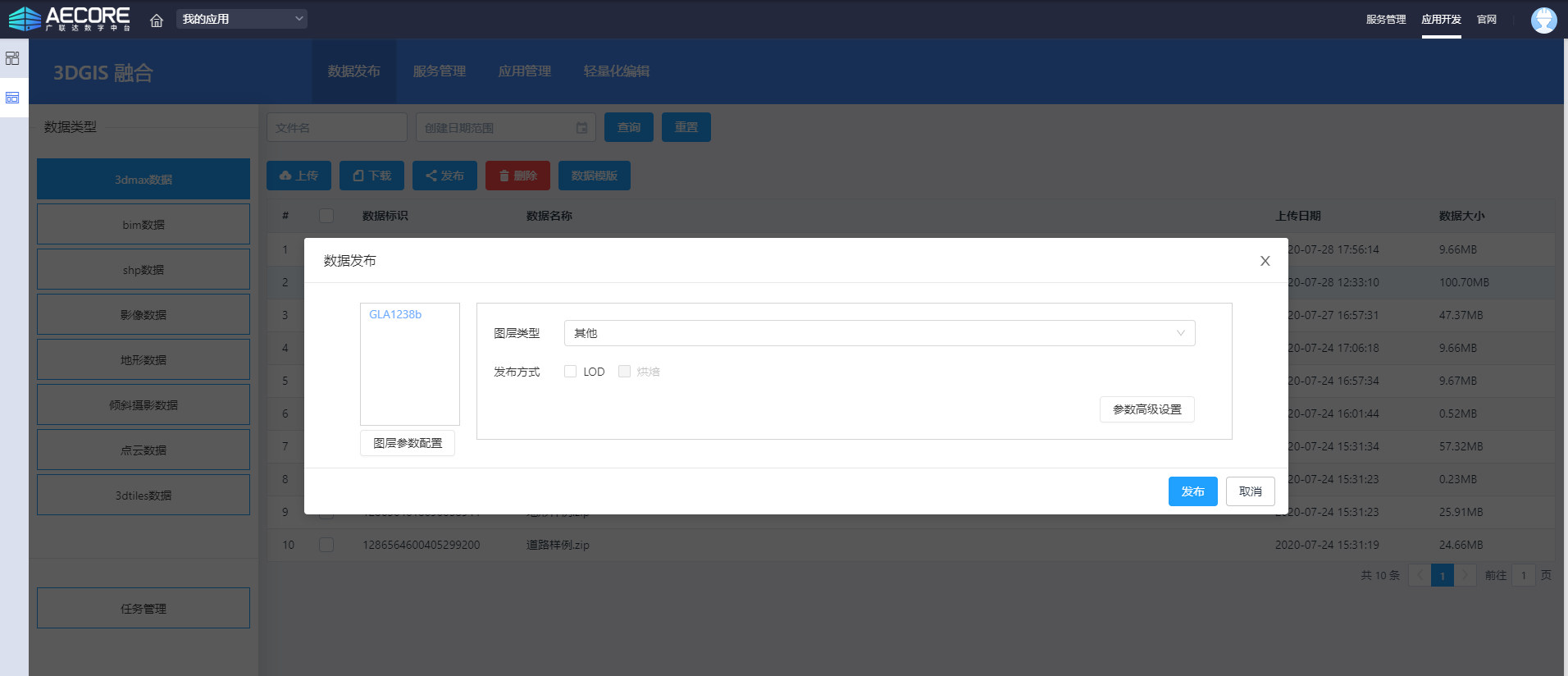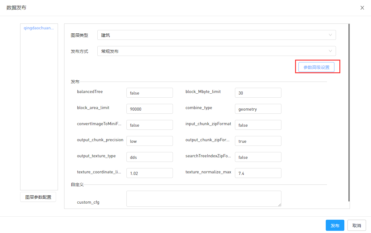 选择【图层类型】和【发布方式】,系统将3dmax的数据类型和常见发布方式进行了组合,默认给出了各组合的最优建议参数,用户可以无需修改任何参数,直接发布即可。