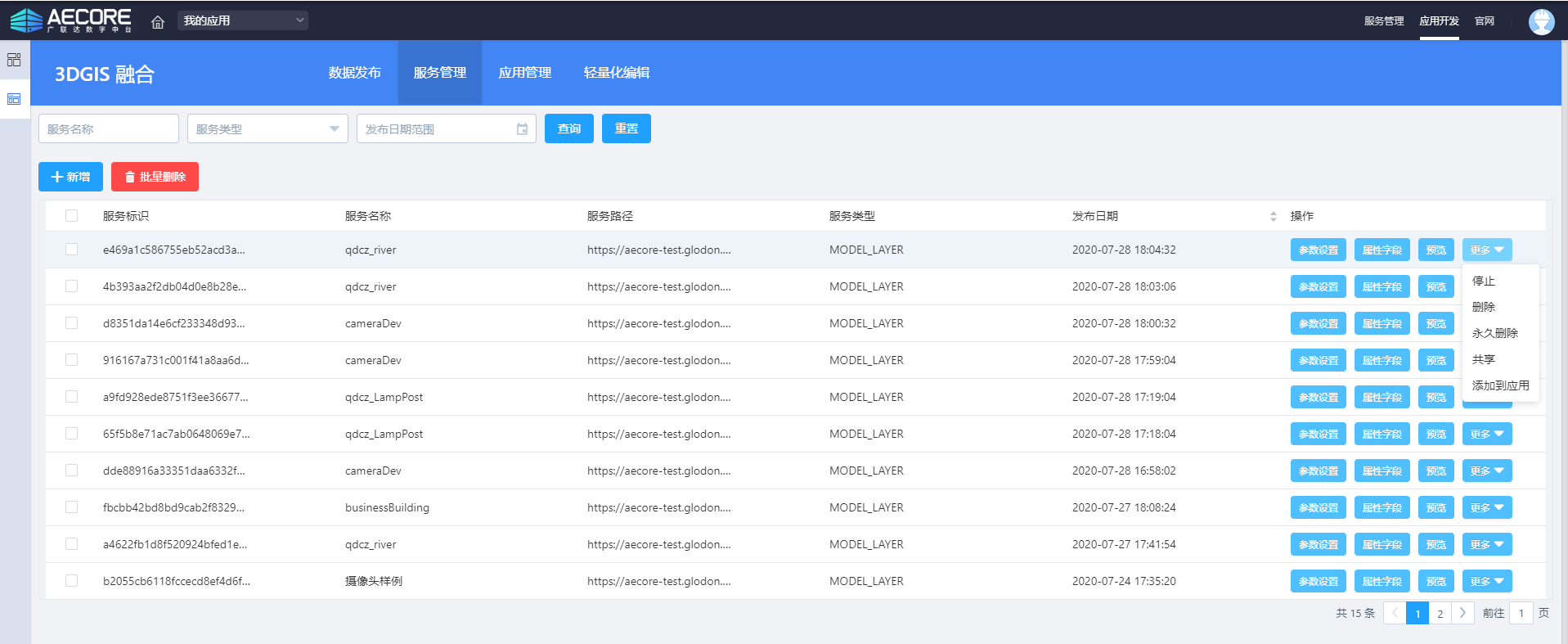 发布完成的图层,点击【服务管理】模块,可以在地图列表进行查看,如下图 :