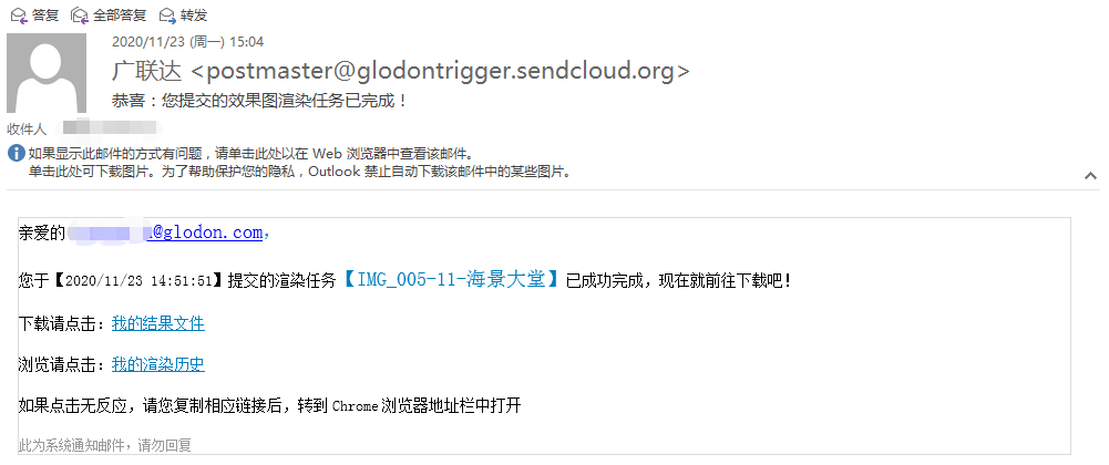 1、方式1:渲染完成后,云渲染服务会通过邮件或者短信及时通知用户。用户收到通知后,使用邮件或者短信内容中包含的下载地址,进行结果下载,如下图所示。(本次渲染任务大概15分钟后会收到渲染完成的邮件通知)