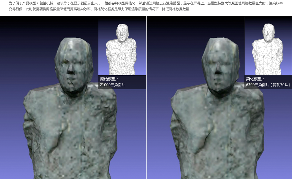 为产品提供模型简化服务。将模型中大数据量网格,按照用户自定义的方式简化,并最大限度保留原有模型特征,从而帮助用户提升模型渲染性能。